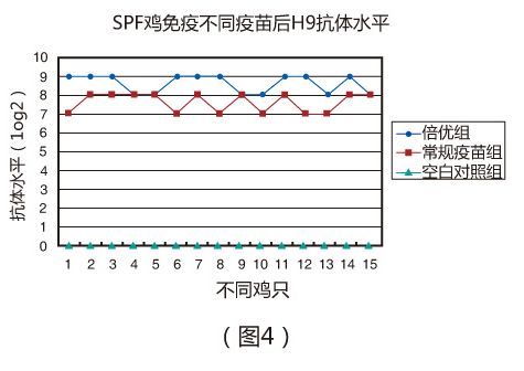 (一)在實驗室條件下,SPF雞7日齡一次免疫倍優?系列產品(ND + H9 ) 0.1ml ,免疫后21天,倍優組ND和H9抗 體分別達到8.1log2 (圖3 )和8.6log2 (圖4 );常規疫苗組ND和H9抗體分別僅為7.3log2 (圖3 )和7.6log2 (圖4)。