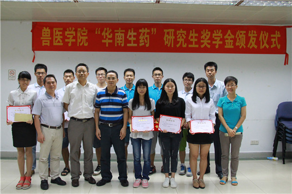 2015年6月24日下午3:30,“華南生藥”研究生獎(jiǎng)學(xué)金頒獎(jiǎng)暨揭牌儀式在農(nóng)業(yè)部畜禽產(chǎn)品質(zhì)量監(jiān)督檢驗(yàn)測(cè)試中心101報(bào)告廳舉行。廣州市華南農(nóng)大生物藥品有限公司梁昭平總經(jīng)理、營(yíng)銷(xiāo)中心黃國(guó)城副總經(jīng)理、公司技術(shù)部李敏經(jīng)理、行政拓展部許芬芬經(jīng)理、我校獸醫(yī)學(xué)院黨委書(shū)記梁梓森、黨委副書(shū)記楊利江、輔導(dǎo)員陳曉梅老師、全體獲獎(jiǎng)學(xué)生和學(xué)生代表出席并參加了掛牌儀式和頒獎(jiǎng)典禮。