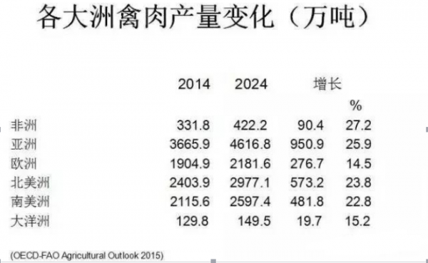 此外,據(jù)FAO(聯(lián)合國糧食及農(nóng)業(yè)組織)統(tǒng)計(jì),全世界雞肉產(chǎn)量保持平穩(wěn)增長,雞肉生產(chǎn)總量近一億噸。但各大洲區(qū)域發(fā)展不太平衡。2014-2040年期間,雖然非洲地區(qū)雞肉生產(chǎn)基數(shù)低,但增長最快,增速為27%。因此在非洲,肉雞生產(chǎn)潛力巨大。