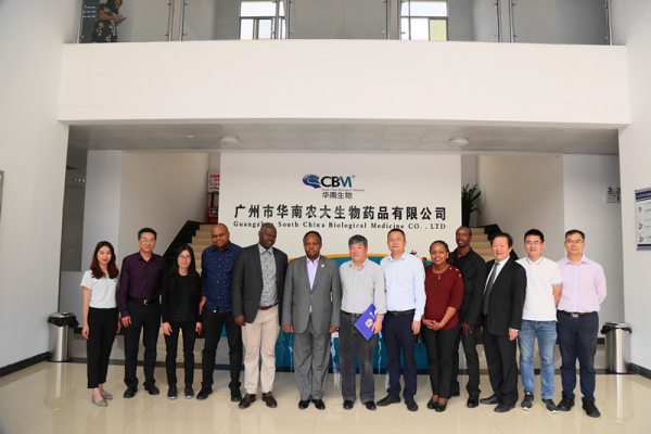 11月8日,肯尼亞內(nèi)羅畢大學(xué)團(tuán)隊(duì)在廣州謝諾中非投資管理有限公司魏曉林執(zhí)行總裁的陪同下到廣州市華南農(nóng)大生物藥品有限公司(以下簡稱華南生物)進(jìn)行參觀交流。