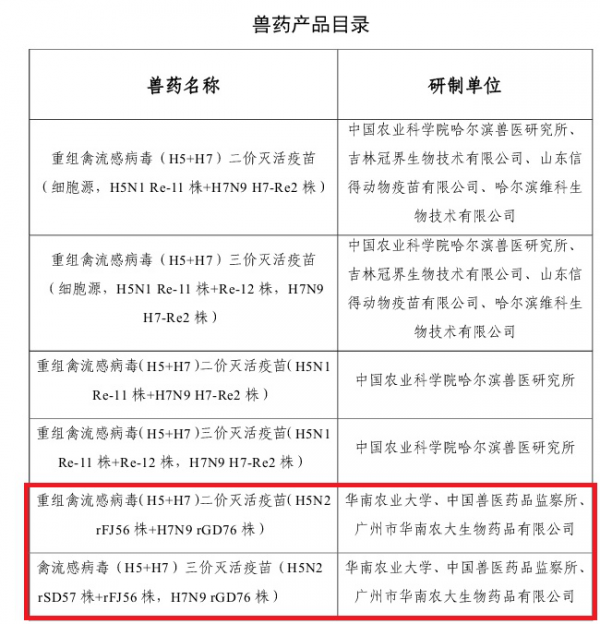 熱烈祝賀華南農(nóng)業(yè)大學、中國獸醫(yī)藥品監(jiān)察所與廣州市華南農(nóng)大生物藥品有限公司聯(lián)合研制的重組禽流感病毒(H5+H7)二價滅活疫苗(H5N2 rFJ56株+H7N9 rGD76株)和重組禽流感病毒(H5+H7)三價滅活疫苗(H5N2 rSD57株+rFJ56株,H7N9 rGD76株)兩個產(chǎn)品通過農(nóng)業(yè)農(nóng)村部新獸藥評價!!!