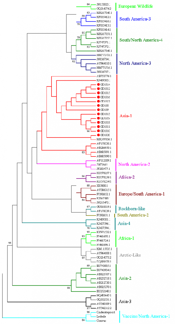 當(dāng)下國(guó)內(nèi)寵物疫苗市場(chǎng)由進(jìn)口產(chǎn)品所主導(dǎo),但是合法注冊(cè)的進(jìn)口產(chǎn)品并不能滿足國(guó)內(nèi)需求。大多數(shù)犬用CDV進(jìn)口疫苗所包含的都是America-1型毒株,而國(guó)內(nèi)主要流行的是Asia-1型毒株。從進(jìn)化譜系分析上來(lái)看疫苗株America-1所在的分支與流行的Asia-1型毒株距離較遠(yuǎn),基因差異可能導(dǎo)致中和表位的顯著變化,從而可能導(dǎo)致疫苗免疫失敗。此外國(guó)外有研究報(bào)道CDV的South America-3型毒株仍可使接種過(guò)包含America-1型毒株疫苗的犬發(fā)病。由此可見(jiàn)符合國(guó)情的疫苗是才是CD防控的需求所在。