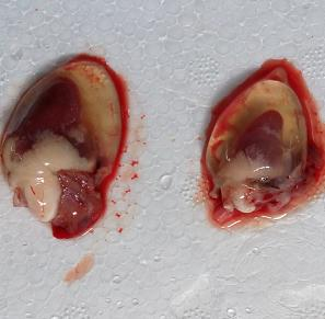 (2)心包積液綜合征:剖檢病變主要表現(xiàn)為心包腔內(nèi)有黃色清亮水樣或膠凍樣液體,心肌柔軟,有壞死點(diǎn)。肝臟腫大、質(zhì)脆易碎、有壞死灶;脾臟腫大;肺水腫、充血等。